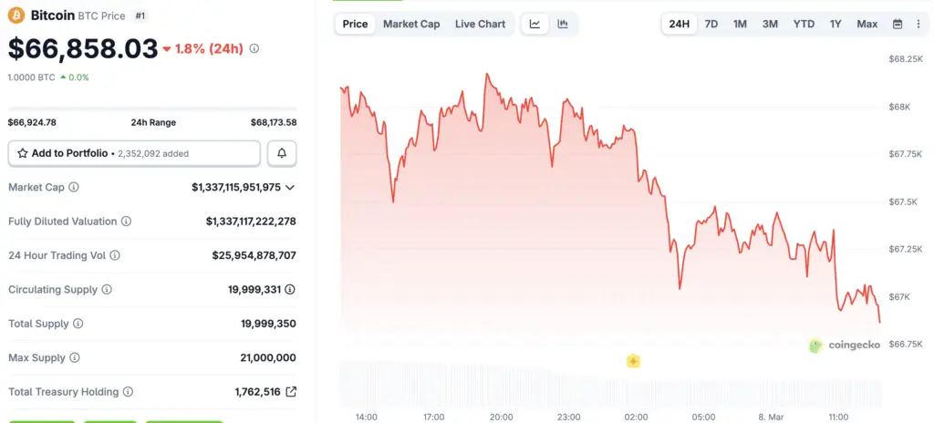 By early March 2026, Bitcoin was trading near the $67,000 level. That price represents a decline of roughly forty-six percent from its previous all-time high.