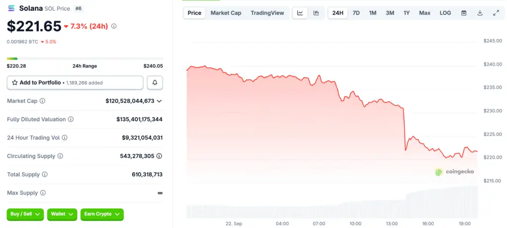 Solana (SOL) climbed above $250 on Sept. 14, reaching its highest level in nearly eight months. But currently, it’s trading at $221.65. The move pushed its market capitalization beyond $133 billion, firmly securing its place as the fifth-largest cryptocurrency.