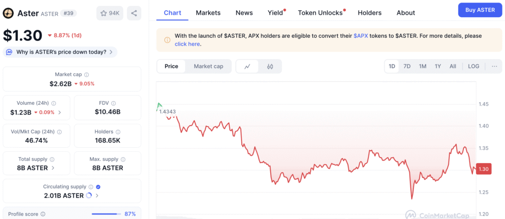 After a period of notable strength, Aster’s recent pullback indicates a temporary fatigue in its upward momentum. The token’s price, which had previously stabilized above $1.55 earlier in the week, is now encountering fresh challenges as it approaches lower support levels.