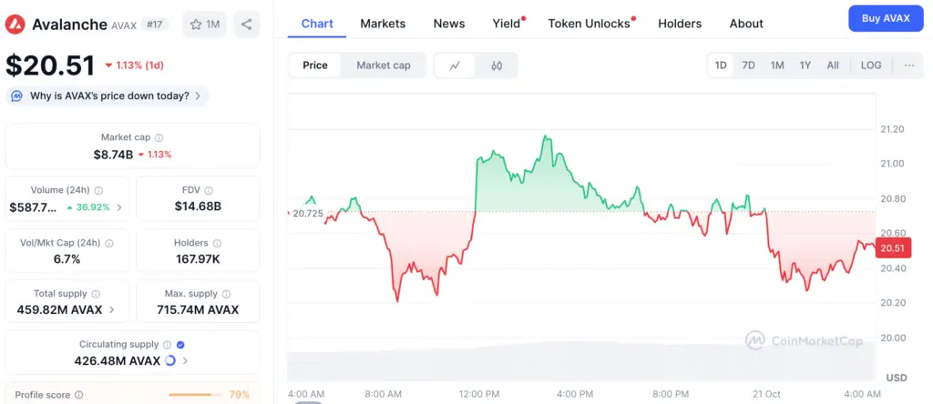 Avalanche is currently valued at $21.02, recording a daily gain of 5.11%. The token remains above key moving averages on daily charts, signaling renewed upward momentum. Maintaining a price above $20 could significantly improve the odds of an advance toward $30.
