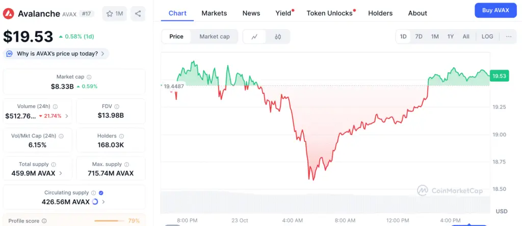 The price of Avalanche’s native cryptocurrency, AVAX, is going down again as technical indications turn negative for the first time in months. Over the past week, the token has lost around 15% of its value and is already below the important $21.50 support zone. At the time of writing, AVAX is trading at about $19.43, which means that bears are firmly in charge of short-term momentum.