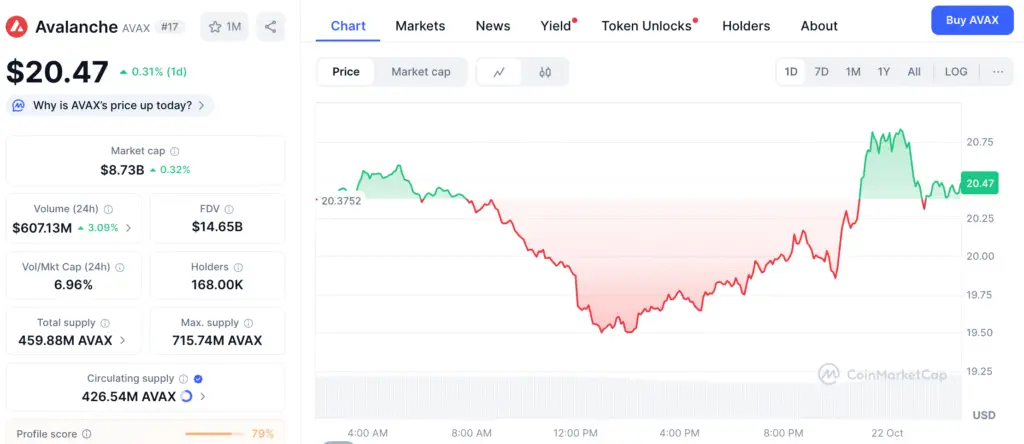 As we get into the fourth quarter of 2025, Avalanche is at a crucial turning point because of strong fundamentals and a good technical structure. The currency is trading close to $21, and it has gone up 5% in the last 24 hours as trust steadily returns.