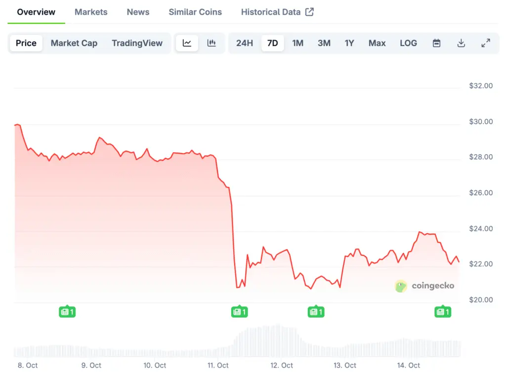 Even with strong daily momentum, weekly indicators suggest some slight pressure. The Moving Average Ribbon indicates resistance levels at $23.88, $27.01, and $30.12.