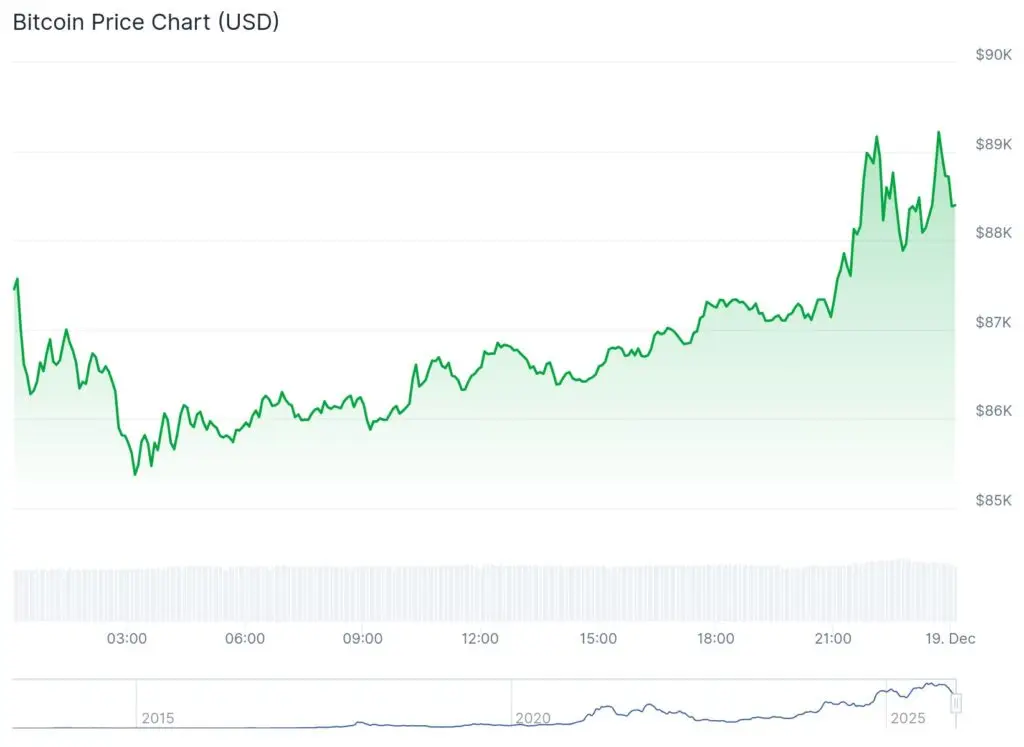 Bitcoin entered the week with cautious optimism after a short-lived rally briefly pushed prices above $90,000. The move initially sparked hopes of a seasonal recovery, but enthusiasm faded quickly as selling pressure returned and erased the gains within minutes. The rapid reversal underscored the market’s fragile condition, particularly as liquidity thins heading into the year-end holiday period.