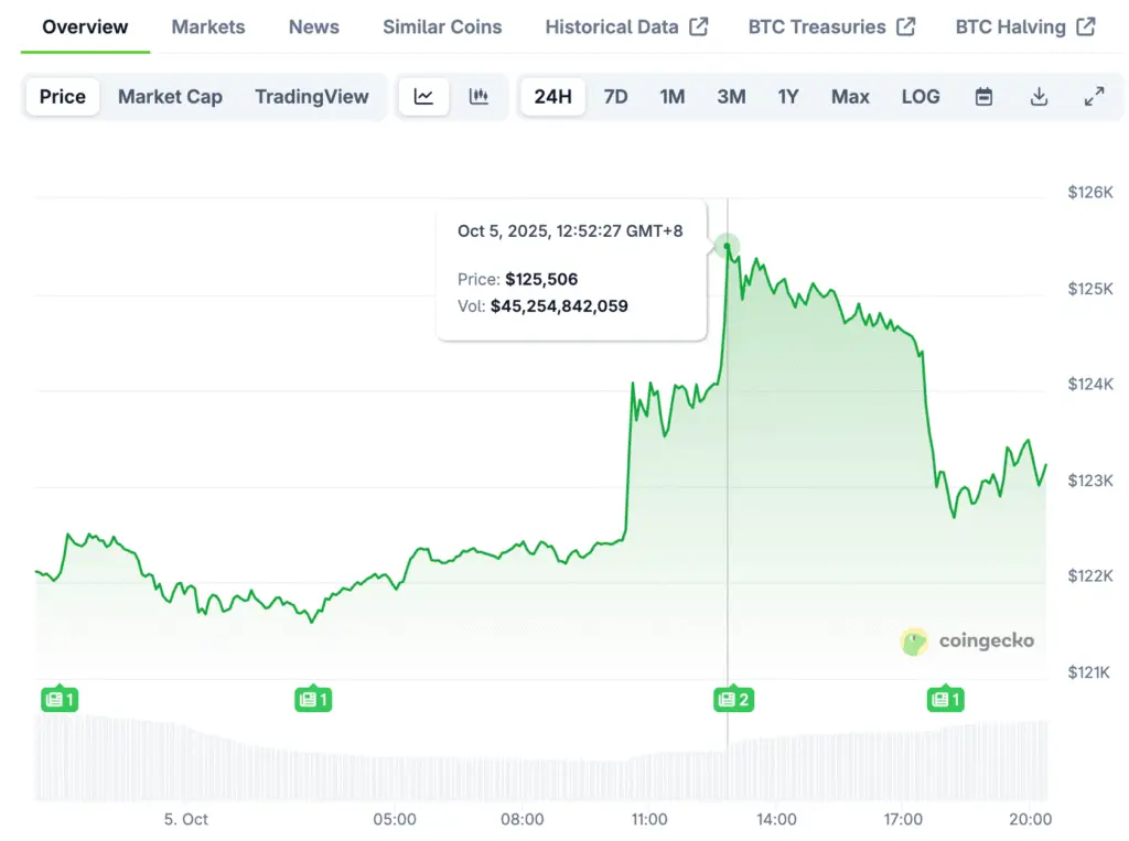 Bitcoin has reached a significant milestone, clearly surpassing the $125,000 mark during a late-night trading session in Uptober. At 11:45 p.m. EST on October 4, the price skyrocketed to $125,725, as reported by Bitstamp market data that has been circulated extensively.