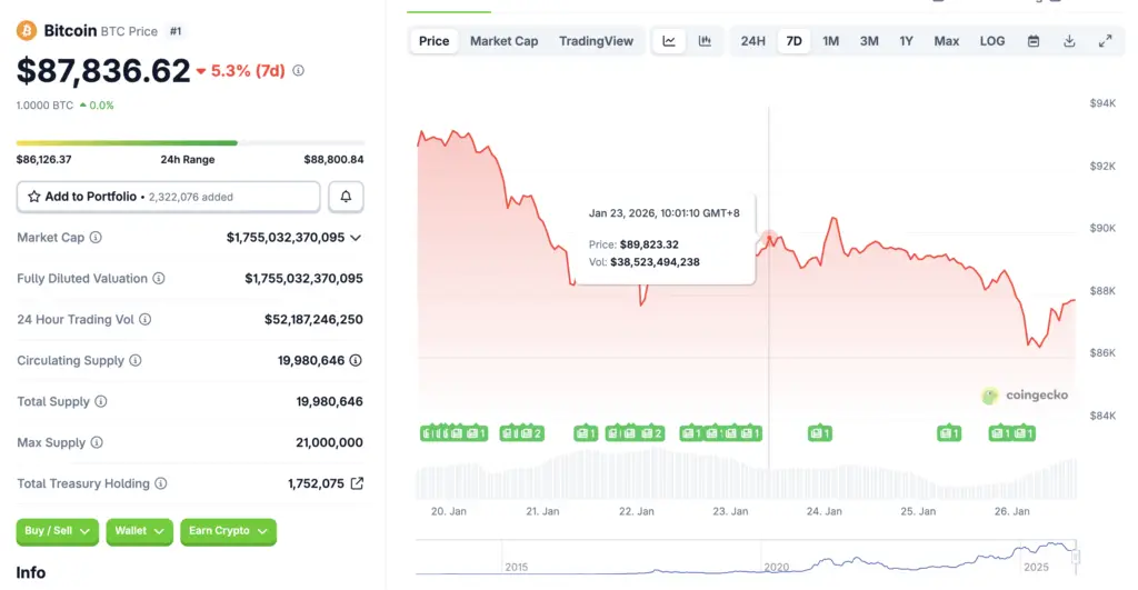Over the past week, Trump’s public comments at forums such as the World Economic Forum — where he suggested that broad crypto legislation could soon be passed — helped spur renewed interest in Bitcoin as a politically relevant asset class. These signals reinforced the narrative that Washington could formalize long-sought regulatory clarity for crypto markets, a theme that has boosted sentiment among some long-term holders and institutional participants.