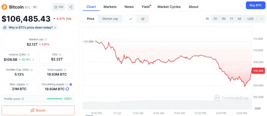 The decline in Bitcoin comes on the heels of a tumultuous week characterized by escalating trade tensions between the U.S. and China. On October 10, the cryptocurrency experienced a significant decline, dropping nearly $17,000 from $122,000 to a low of $101,000 on various exchanges before finding some stability around the $105,000 mark.