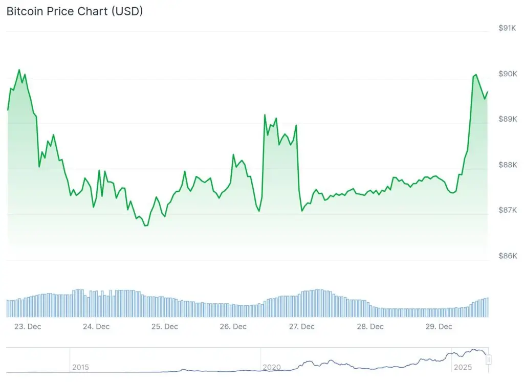Bitcoin climbed back above $90,000 as investors reacted to renewed geopolitical instability. The move followed reports of fresh military strikes targeting critical infrastructure. Market sentiment shifted rapidly as hopes for a near-term peace agreement faded. Thin holiday liquidity magnified the price reaction across crypto markets. Traders rotated capital toward alternative assets amid rising uncertainty. Bitcoin’s rebound ended a week of muted price action. The move restored short-term bullish momentum.