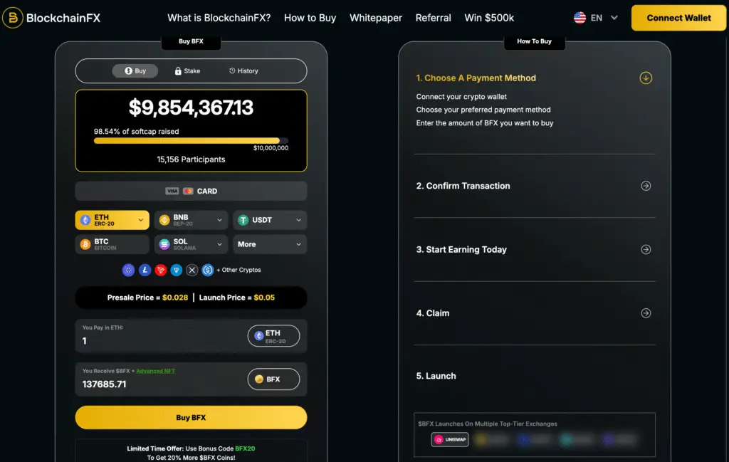 BlockchainFX has attracted over 14,500 investors worldwide, with a presale price of $0.028 providing a significant advantage before the price rises to $0.05. Using the BLOCK30 code, investors receive a 30% bonus, resulting in 46,428 BFX tokens for a $1,000 investment.