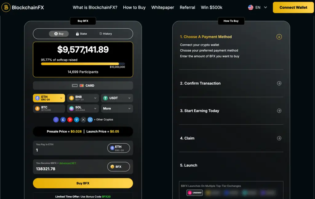 BlockchainFX’s presale has seen significant growth, with prices rising from $0.01 to $0.028, indicating a confirmed launch target of $0.05. Initial backers are assessing potential gains, with a $50,000 investment potentially growing to $250,000 at launch and potentially surpassing $1.78 million if $BFX achieves its long-term goal of $1.