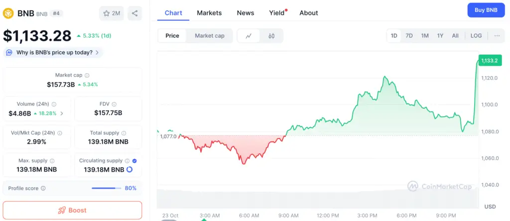 The cryptocurrency is still one of the best-performing large-cap assets in 2025, even if the market as a whole has been unstable and it hasn’t lost much value. As Bitcoin and Ethereum prices go up and down, BNB’s consistent trading range shows that long-term investors are becoming more confident in the asset as a key part of the DeFi ecosystem.