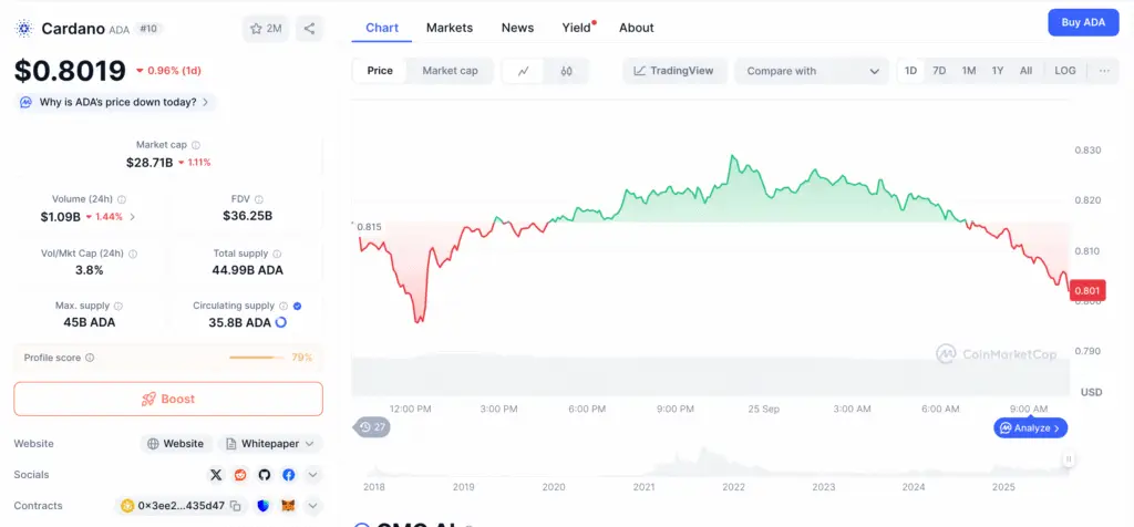 Cardano (ADA) is trading near $0.81 after modest gains, though it has fallen 5% in the past week. Analysts suggest that ADA may see a deeper pullback before resuming its upward trajectory.