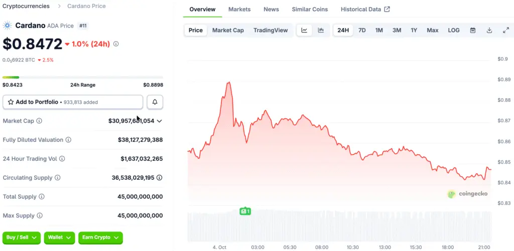 As we approach Q4, Cardano showcases a blend of technical strength, positive on-chain indicators, and robust community engagement. The support level at $0.85 has proven to be reliable, while the next significant resistance points to watch are $0.90 and the psychological barrier at $1.00.