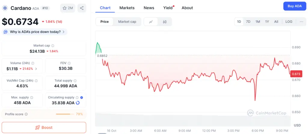 Cardano (ADA) has clearly entered a bear market this month, with its price dropping to $0.6680 after struggling to maintain gains above $1.0205 in August. The drop in the cryptocurrency reflects the overall market’s struggles, yet it is intensified by its weakening technical framework and slow on-chain engagement.