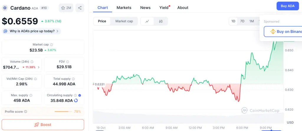 Cardano’s price has shown significant improvement in recent sessions, currently trading at approximately $0.6343 following a 4.5% increase in the last 24 hours. The asset currently boasts a market capitalization of $22.84 billion, securing ADA’s status as one of the leading cryptocurrencies priced under $1.