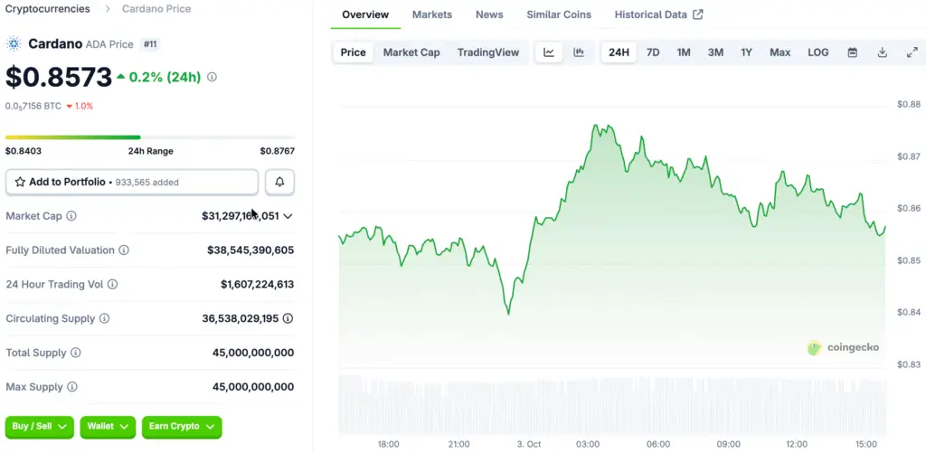 Cardano has shown a consistent recovery after its recent decline, rising above $0.85 and sparking renewed conversations among investors about a possible breakout to $1. This increase has taken place even with clear selling spikes, showcasing how a resurgence in demand is effectively offsetting short-term market pressures this week.