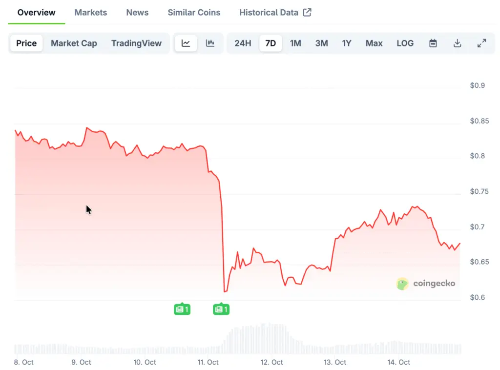 Cardano (ADA) has found itself in a precarious position after not being able to maintain the essential $0.72 support level earlier this week. The altcoin is currently priced at approximately $0.68, reflecting a decline of about 20% over the past week due to a general downturn in the cryptocurrency market.