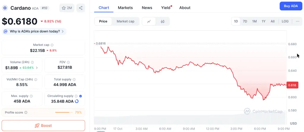 Currently, ADA is priced around $0.60, showing a daily decrease of 3.5% and a monthly decline of 22%. The token has faced challenges in sustaining support levels after a widespread market decline that affected both Bitcoin and Ethereum.