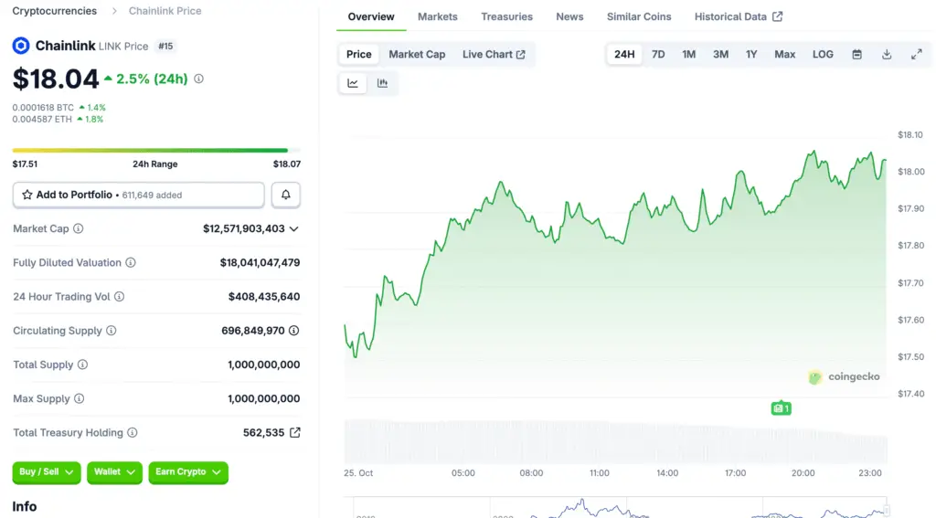 Chainlink’s price has remained steady near $17 following weeks of volatility across the crypto market. Despite a mid-October dip to $16, LINK quickly regained footing amid renewed investor confidence. Analysts note that its Fibonacci retracement support at $15 continues to serve as a strong defense zone. This resilience indicates a healthy consolidation phase that could precede the next major rally.