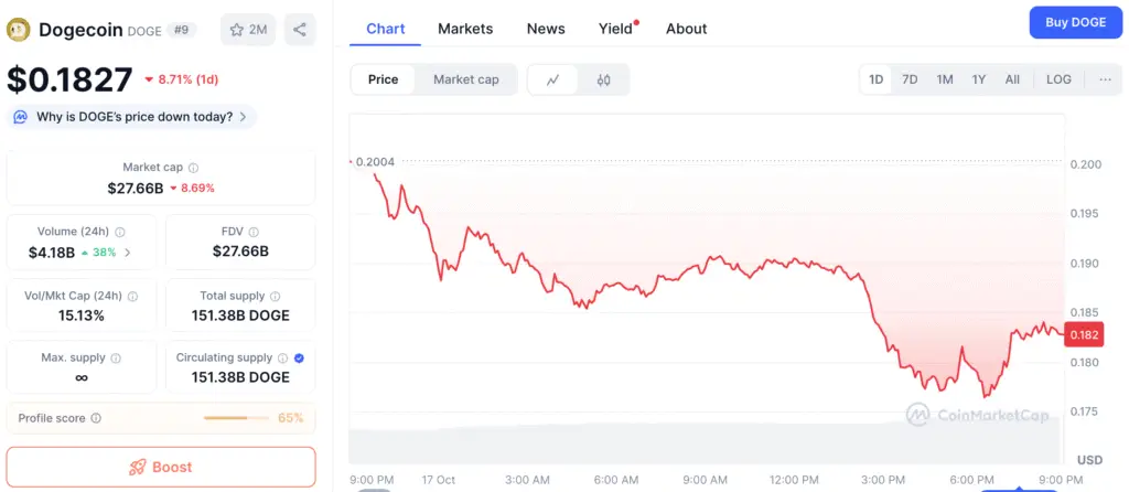 The next 48 to 72 hours may shape the immediate path of Dogecoin. If buyers maintain the $0.19 support and volume increases, DOGE may rebound towards mid-range resistance levels. Nevertheless, ongoing whale selling or persistent market weakness could drive prices down further, prolonging the bearish trend into late October.