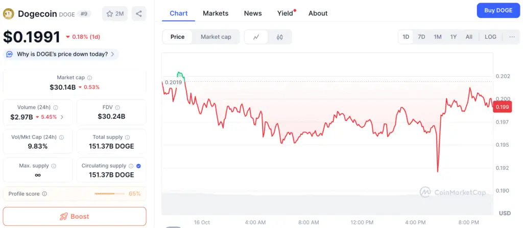 A successful reclaim of the $0.21 resistance may ignite renewed buying momentum, possibly driving DOGE toward the $0.22–$0.28 range, revisiting price levels observed on October 8. Traders are closely monitoring for consolidation and additional confirmation of accumulation patterns until that breakout takes place.