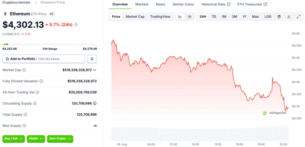 ETH is trading around the $4,329 mark. It is down over the last two weeks. But it is still up 13% over 30 days. This shows relative strength.