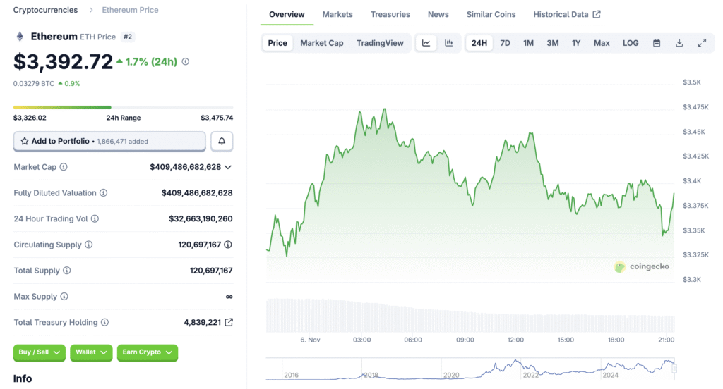 Ethereum fell more than 4.5% to trade around $3,332 as of early November 2025. The broader crypto market also declined 1.5% to $3.4 trillion in total capitalization. These losses come after a turbulent October that saw steep declines across Bitcoin, Ethereum, and major altcoins.