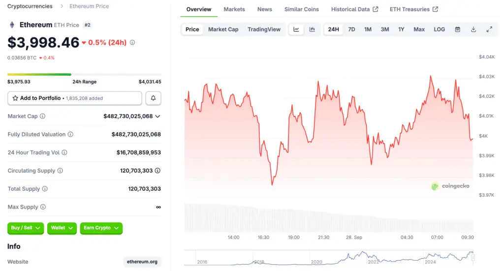 Ethereum’s price is facing its most critical moment in months after a steep decline below $4,000. Over the past 24 hours, ETH has shed another 4%, rattling investor confidence and setting the stage for potential deeper losses. Traders are closely monitoring support levels as the market debates whether this marks a temporary pullback or the start of a significant downtrend.