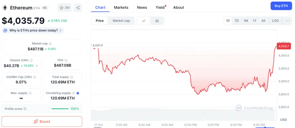 Ethereum (ETH) is still having trouble getting beyond the $4,000 threshold following a week of little price movement. The asset is trading at about $3,935, which is about 6.6% less than it was last week. This is because the momentum of big cryptocurrencies is slowing down. Ethereum is still on the rise in the long run, even though it has pulled back. However, the market’s reluctance shows that it needs stronger confirmation over critical resistance levels.