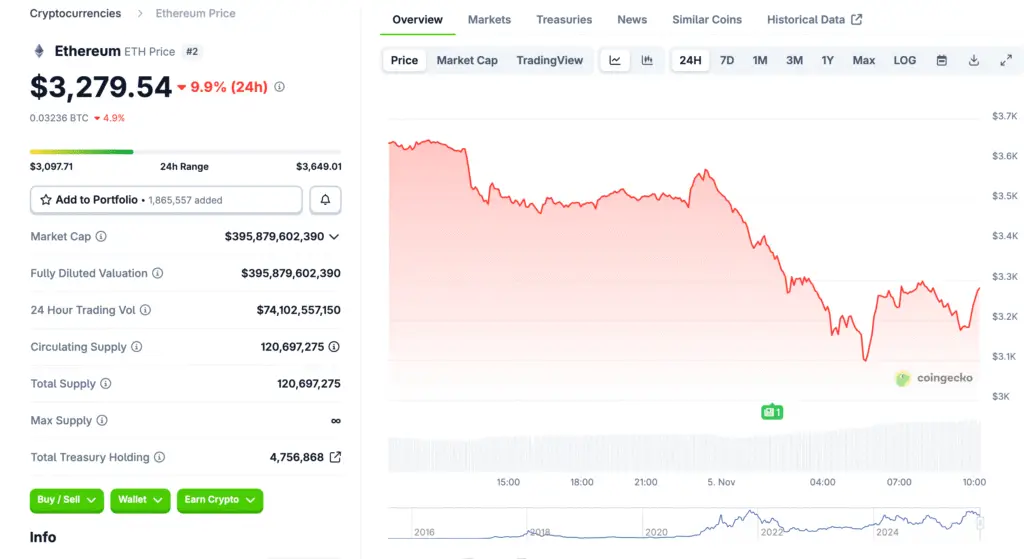Ethereum’s price decline continues as bearish sentiment dominates the market. The token slipped below $3,500 on Tuesday, marking its second consecutive day of losses. Analysts attribute this weakness to heavy ETF outflows and reduced investor participation from both institutional and retail traders.