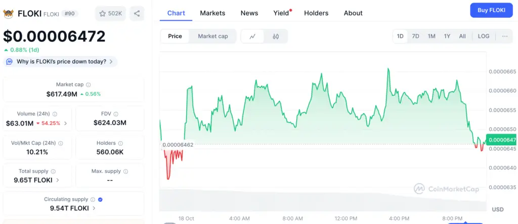 FLOKI has experienced a dip, dropping 9.16% over the last 24 hours to a trading price of approximately $0.00006433. Initial intraday momentum diminished after peaking at $0.00006501, prompting profit-taking that resulted in losses by midday.