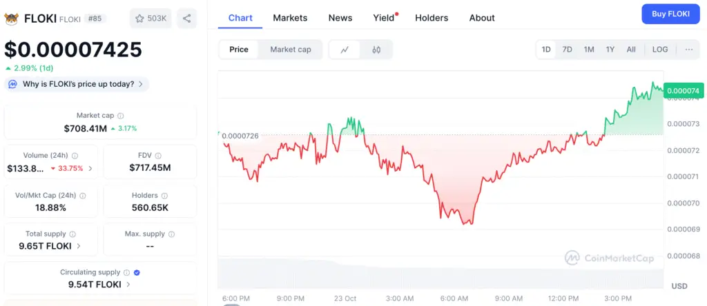 BraveNewCoin says that FLOKI trades for around $0.00007100, which is down 3.82% in the last 24 hours. The coin has a market worth of $686.5 million and trades over $171.8 million per day. Even if the price dropped, FLOKI is still one of the top meme currencies in the world. This shows how strong its community is and how many people are still interested in it.