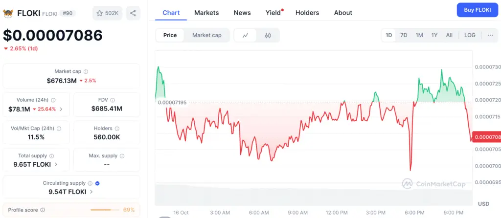 Technical readings from TradingView indicate a neutral-to-bearish configuration. FLOKI is currently priced at approximately $0.00007122, reflecting a decline of 4.67% for the day, following its inability to maintain the momentum gained from its recent local peak close to $0.00015777. The token’s trend of lower highs and lower lows indicates diminishing upward momentum, with significant resistance at approximately $0.00010 persistently limiting upward movements.