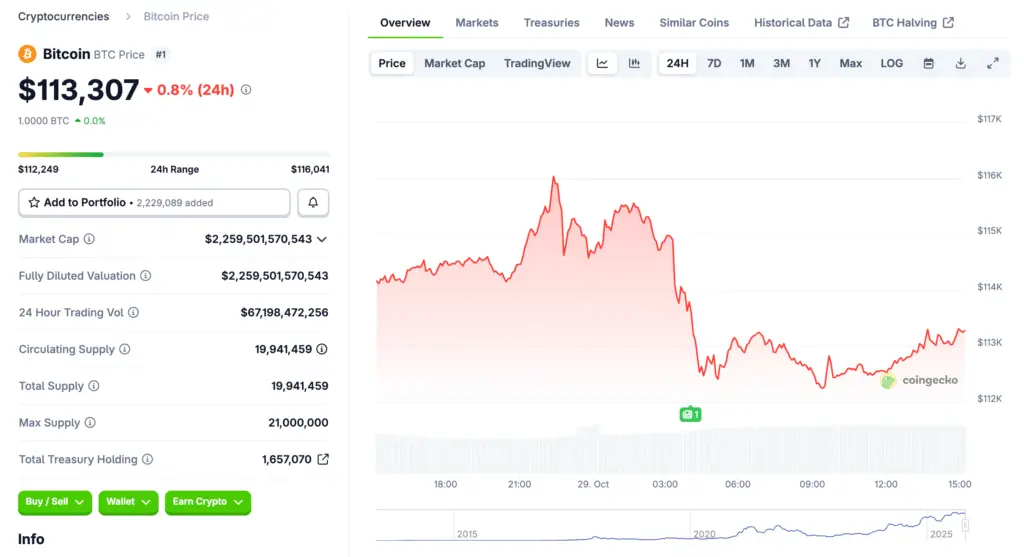 Analysts note that despite short-term volatility, institutional inflows into Bitcoin continue to expand globally. Traders view the current consolidation as a healthy pause before a potential macro breakout. With the 20-day EMA at $114,900 acting as dynamic resistance, momentum could quickly shift once price reclaims this level. The RSI near 49 suggests neutral momentum, leaving room for renewed bullish expansion.