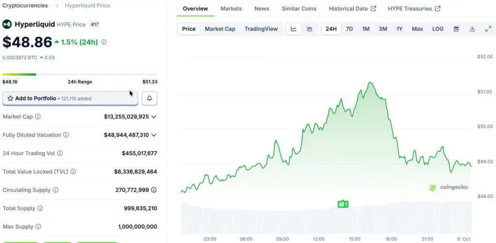 HYPE is currently trading at approximately $49.03, with a daily trading volume of about $393 million. It is maintaining a position between strong support levels of $46 to $47 and facing a significant resistance level at $52. Bulls have consistently defended lower boundaries, sustaining a positive outlook as long as price action remains above the $50 pivot levels.
