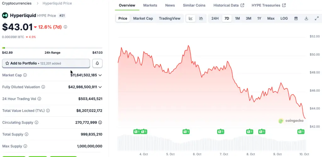 Hyperliquid experienced its 5th consecutive daily drop, decreasing by nearly 6% and trading in the vicinity of the $45 mark. The rejection came after an effort to break out above the recently regained ascending trend line earlier this week.