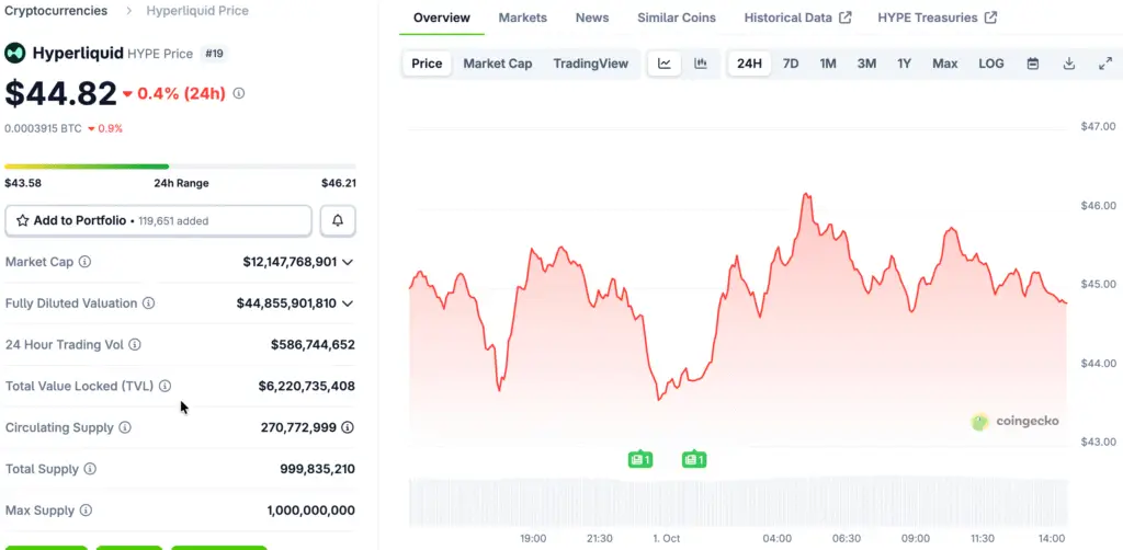 The crypto market has bounced back sharply in the last 24 hours, and Hyperliquid (HYPE) is one of the best performers. The decentralized exchange token rose 7% every day, getting closer to the $48 level as the mood in the market turned bullish.