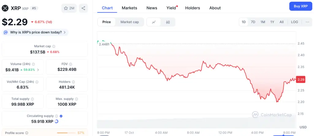 XRP is encountering ongoing selling pressure, finding it difficult to sustain momentum above its key resistance levels. The token is presently valued at approximately $2.27, indicating a 6% decrease in the last 24 hours and a 19% fall over the course of the past week. The persistent barrier around $2.80 remains a significant hurdle for recovery efforts, raising growing apprehension among traders that an inability to regain this level may lead to intensified losses.