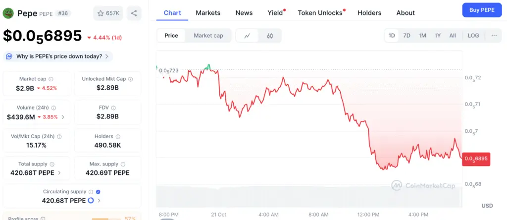 Despite the drop, bulls continue to defend a critical accumulation zone between $0.0000065 and $0.0000070. If Pepe can sustain support above these levels, technical signals suggest a potential rebound toward $0.0000080. However, failure to maintain support may allow the bearish trend to persist for an extended period.