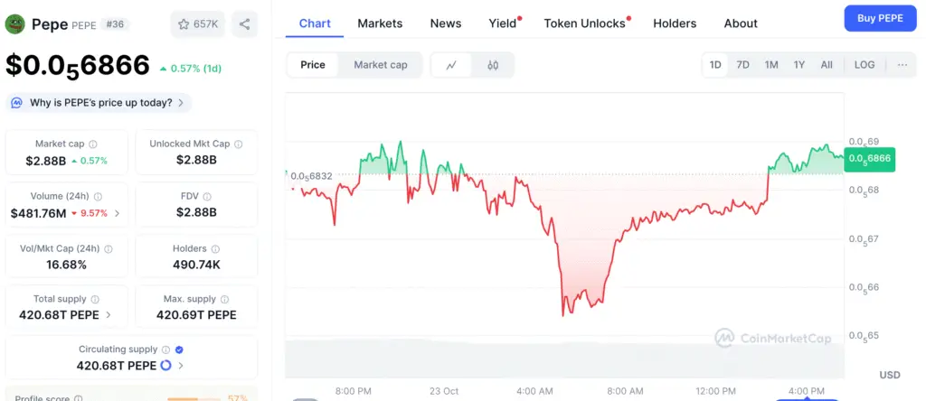 Pepe is still one of the most well-known meme currencies on the market, even if it has seen big corrections and swings. The combination of whales buying up shares, technical stability, and renewed internet interest makes it look like there may be a short-term rise.