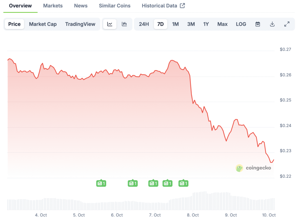Experts caution that if demand continues to be weak, prices may drop to around $0.200 and could potentially approach the all-time low of approximately $0.184. This situation indicates a possible downside risk of around 23% from the current levels.