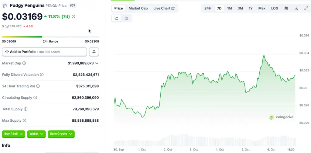 Pudgy Penguins experienced a remarkable price surge of 8.2% within just 24 hours, climbing to $0.03388 as notable crypto investors ramped up their accumulation efforts. This notable surge came after consistent buying efforts that established PENGU as the top memecoin among various prominent trading communities.