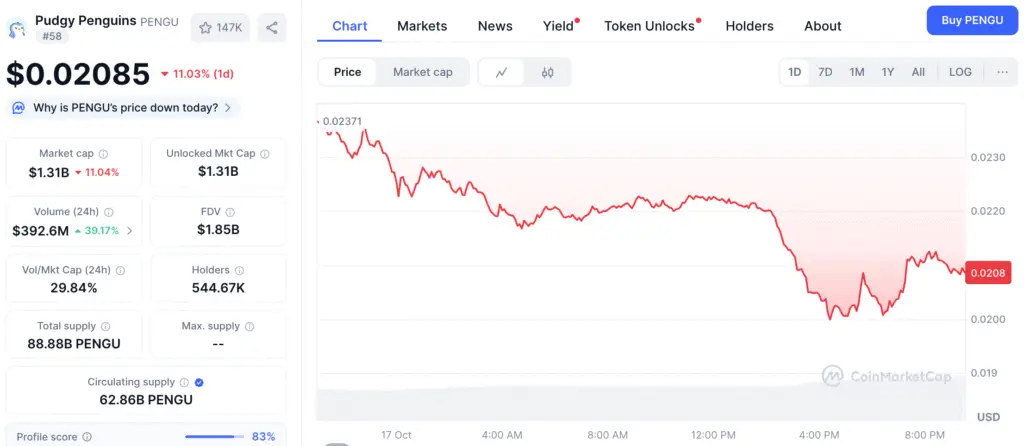 Pudgy Penguins (PENGU) is currently positioned at approximately $0.023, maintaining a position just above an important support level as traders assess the likelihood of a significant breakout or a possible retreat. Following an extended period of selling pressure, the mood in the market continues to be delicate, as the majority of participants are taking a careful approach.