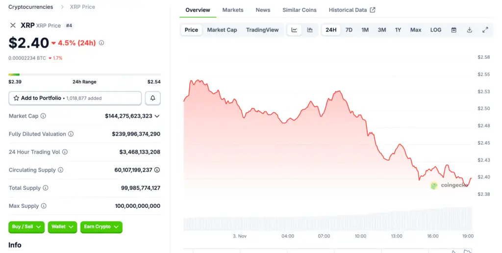 From a technical perspective, XRP has stabilized near $2.52, recovering slightly after an 11% October decline. Analysts are monitoring support at $2.35 and $2.20, while resistance remains near $2.62 and $3.00. A confirmed breakout above $2.80 could reignite bullish sentiment and open the door to retesting the $3.66 all-time high.