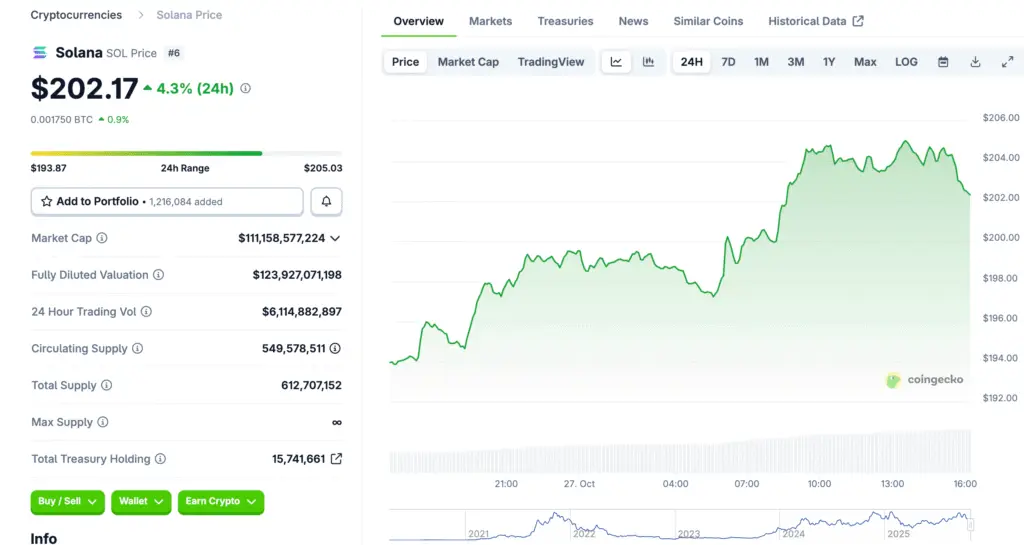 After a slow start to October, Solana has reclaimed its bullish momentum thanks to improving macroeconomic conditions. Bitcoin and Ethereum have both rebounded strongly, lifting overall crypto market sentiment. Solana surged past the $200 level on Sunday, signaling renewed institutional and retail interest. This upward shift follows major policy changes from the U.S. Federal Reserve that have eased liquidity concerns.