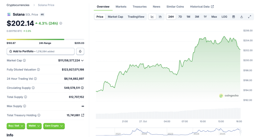 Solana’s native token, SOL, has rallied near the $200 level after recovering from early October declines. The price movement coincides with improved on-chain metrics and broader market recovery. Technical indicators show strong support forming near $184, with resistance observed around $199–$203. A decisive close above this range could confirm the next bullish continuation phase.