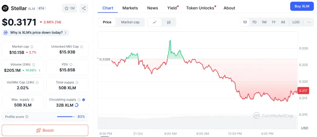 Stellar is currently trading near $0.328, slightly above recent lows, suggesting early signs of market recovery. If the overall sentiment across the crypto market remains steady, analysts believe the current price structure could establish the foundation for a long-term rebound.