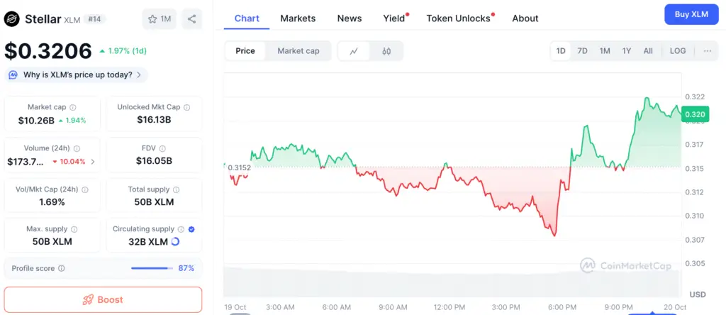 Recent data shows that Stellar has achieved a daily gain of 6.69%, backed by more than $273 million in trading volume over the past 24 hours. The cryptocurrency currently holds a market capitalization of $10.02 billion, placing it 19th in the global rankings, with a circulating supply of 32 billion tokens.