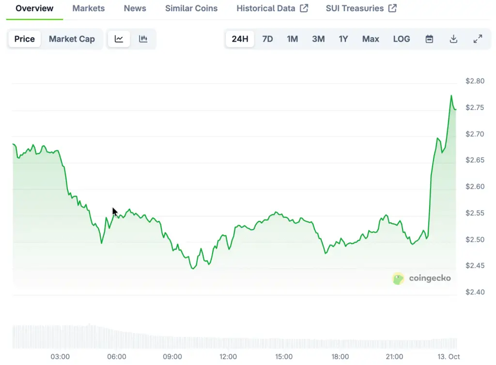 Market participants characterize Sui’s present configuration as a bullish swing pattern, highlighting the presence of higher lows and consistently tightening resistance formations. If the momentum continues, traders anticipate encountering resistance at $3.80, which could lead to a potential breakout toward $4.40, provided there is a simultaneous increase in volume.