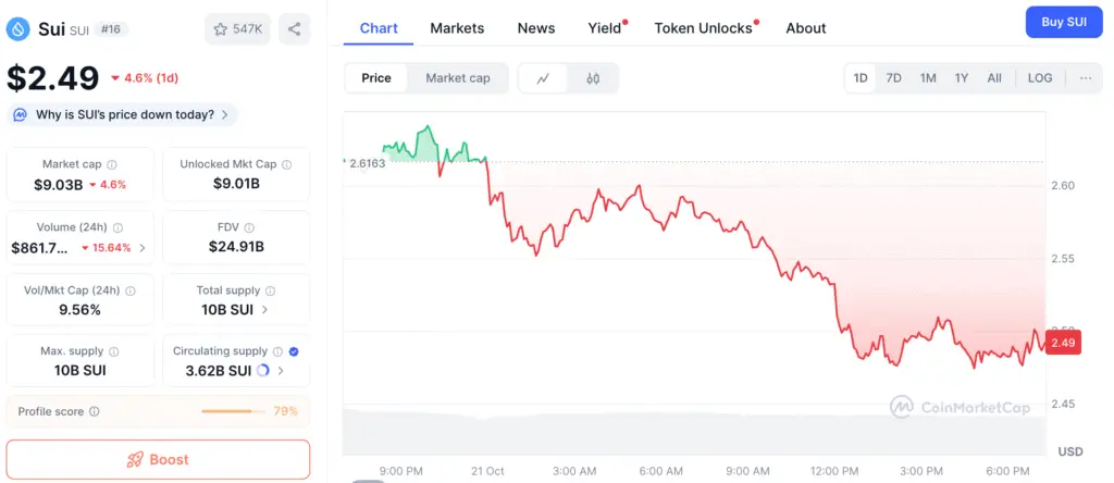 Sui currently trades around $2.70, showing early stabilization despite recent pressure from token unlocks. Analysts believe that renewed buying interest at these levels could precede a sustained recovery if market confidence strengthens and volatility continues to ease.